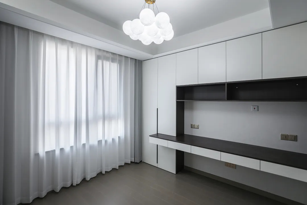 依據客戶的辦公需求,我們設計了獨立的書房空間。地板采用了深色木質材料,墻壁上安裝了多個白色的儲物柜,在房間的一側,設計了一個大型的黑色開門書柜,滿足書籍收納需求。