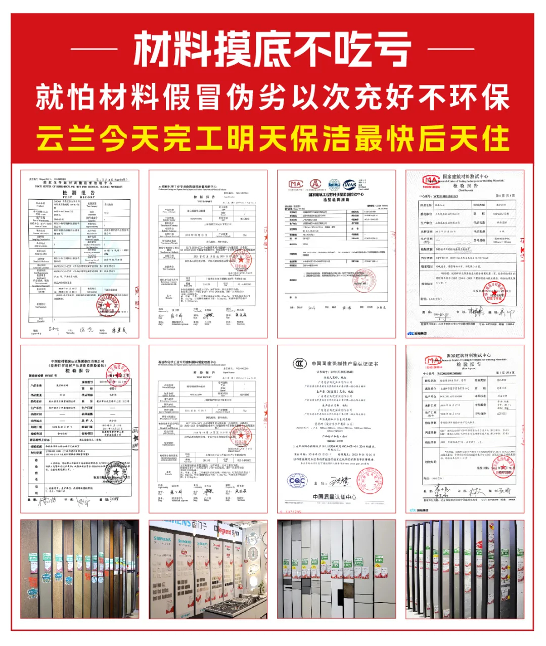 云蘭整裝王深知環保建材的重要性,因此在建材選擇上絕不含糊。我們擁有近10000㎡的實景展廳,嚴選近100家國內外知名品牌,5000余種材料實樣展示。這些材料都是通過正規渠道采購,擁有環保證書,甲醛排放達到E0級,這是目前環保標準中極為嚴格的一個等級,能有效減少有害物質對家人的侵害。而且,我們的主材都是明碼標價,比價商超,若發現有差價,還會給予貴一賠三的承諾,讓您在選擇環保建材時更加放心。