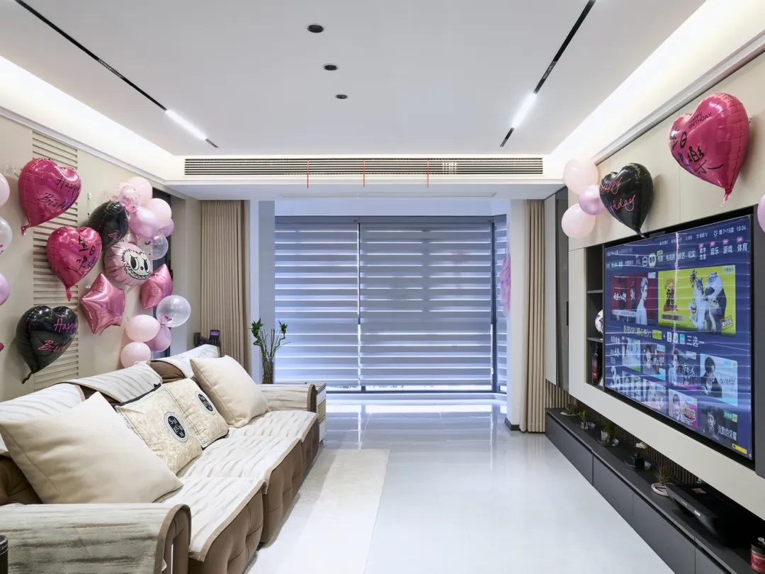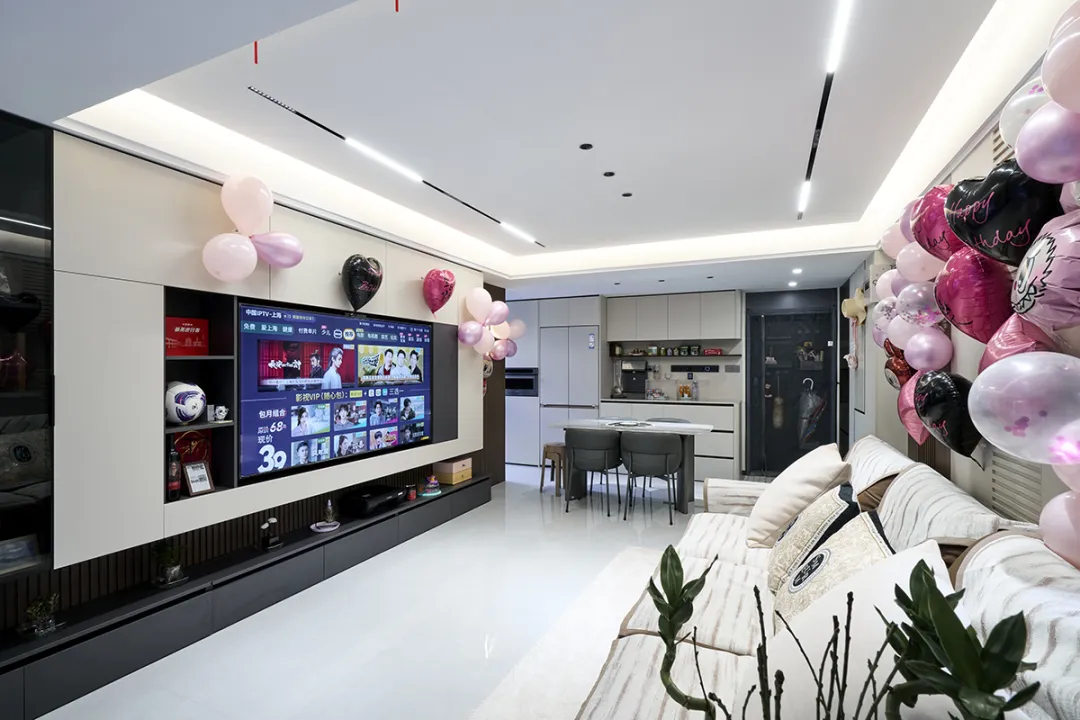 在家具選配上,采用色澤明亮的家具,搭配精致的電視墻板,營造出華麗、簡約、溫馨的氛圍;