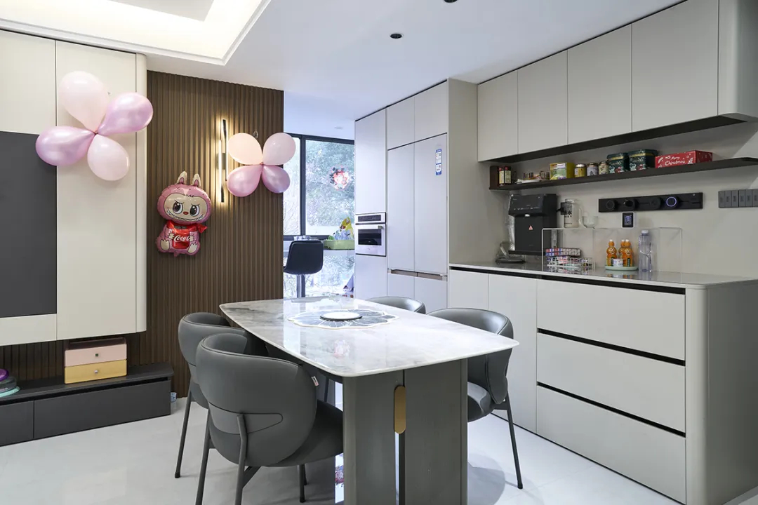 餐廳空間方正,冰箱與餐邊柜連為一體,中間配備管線機(jī),設(shè)計巧妙且實(shí)用。頂面采用無主燈設(shè)計,燈光照度恰到好處,營造出溫馨的用餐氛圍,讓每一次聚餐都成為享受。