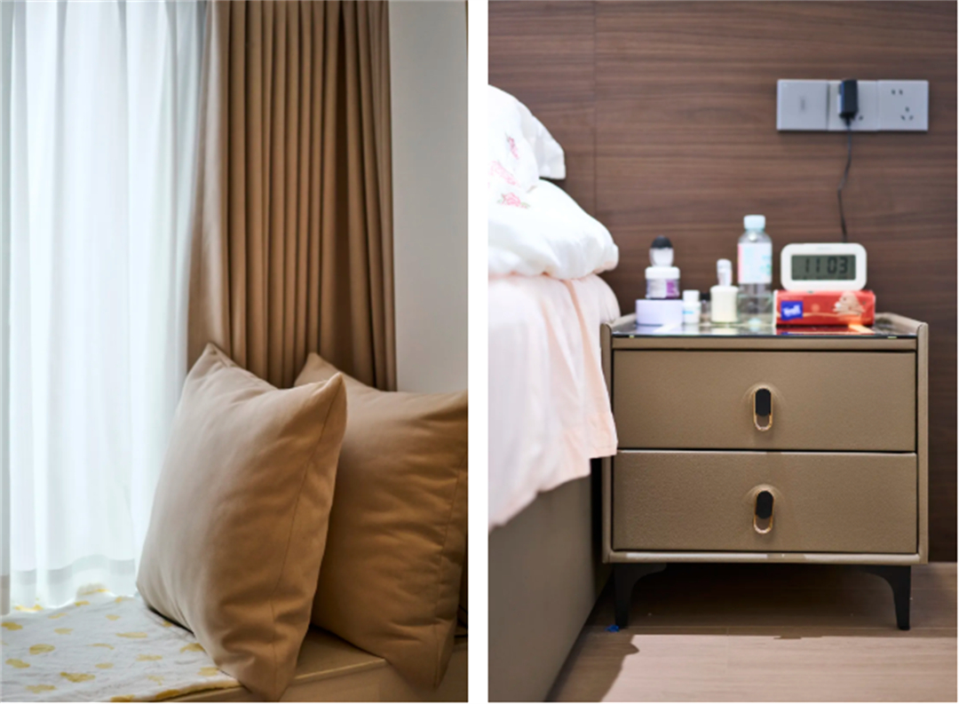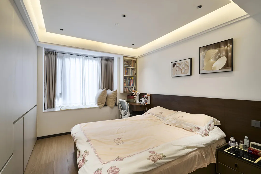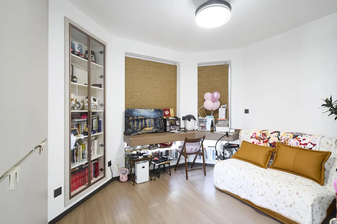 女兒臥室增加了窗戶轉(zhuǎn)角柜、書柜和收納空間,墻面留白處配備軟磁,方便日常使用。床頭的卡通燈增添俏皮可愛的氛圍,對面設(shè)有展示柜和衣柜,功能互補(bǔ),為孩子打造了一個充滿童趣且功能齊全的成長空間。