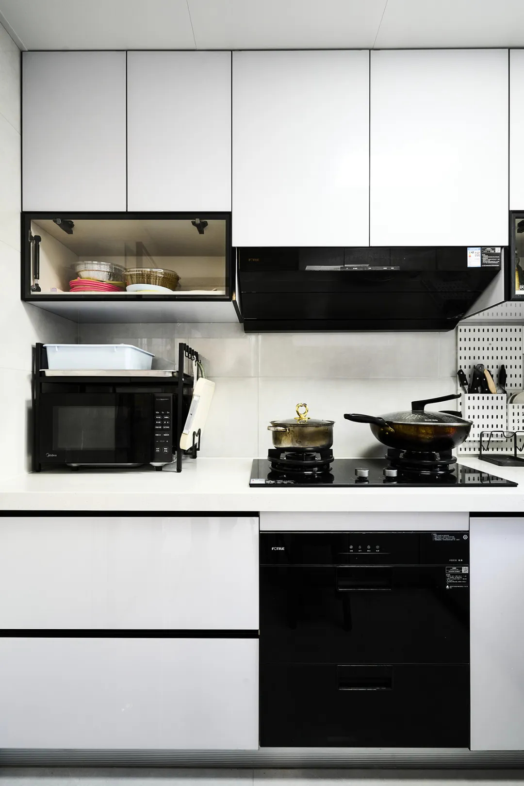 廚房空間較大,采用U字型櫥柜布局,蒸烤一體機(jī)嵌入煤氣灶立柜中,下方配備洗碗機(jī)。