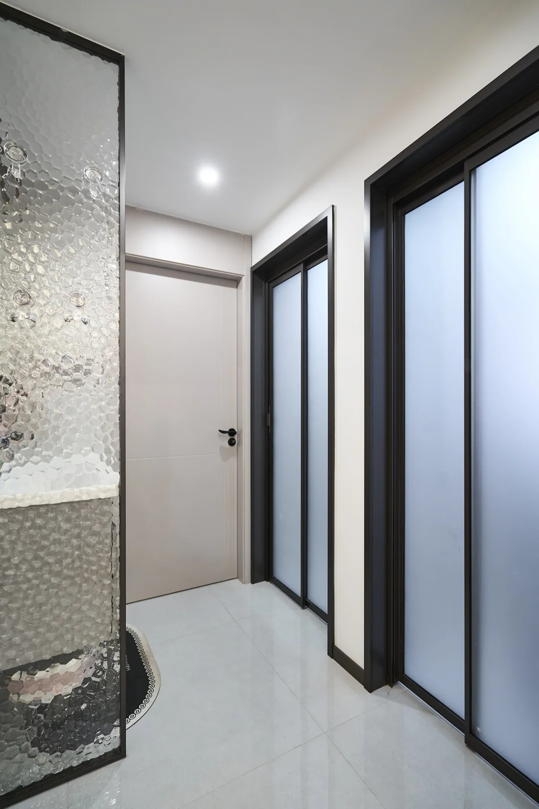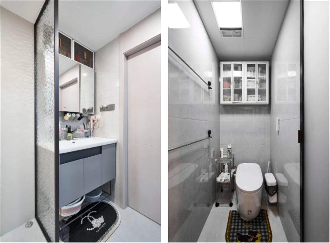 衛(wèi)生間采用一改二設(shè)計,避免早高峰搶廁所的尷尬。地面采用同層排水和掛壁馬桶,兩個衛(wèi)生間均采用PT門處理,實(shí)現(xiàn)干濕分離。