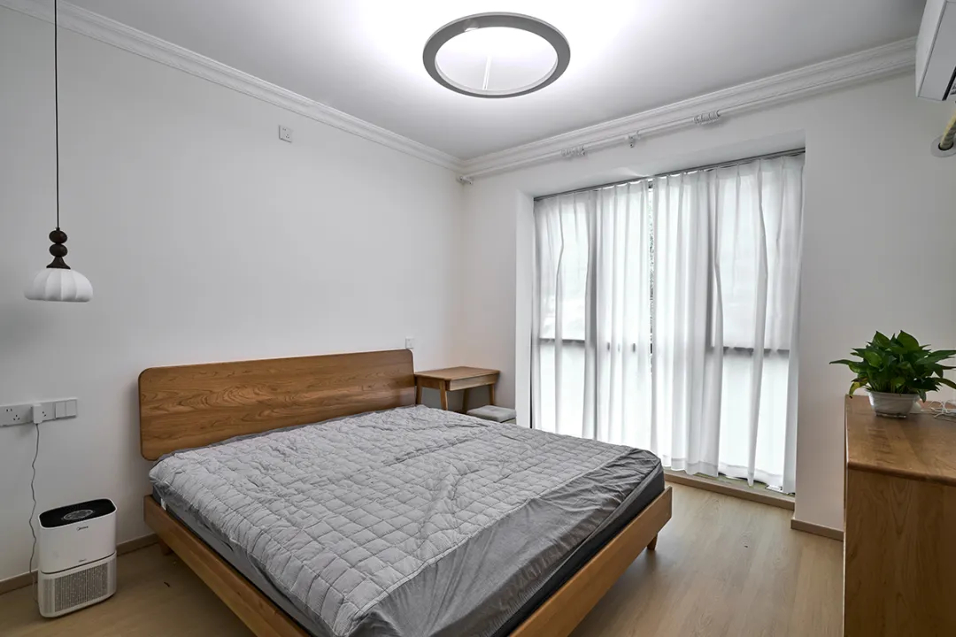 主臥采用白色衣柜搭配原木色實木床和地板,灰色床單從深到淺過渡,錯落有致。床頭的小吊燈作為氛圍燈,與主燈共同照亮空間,完美詮釋了北歐原木風格。