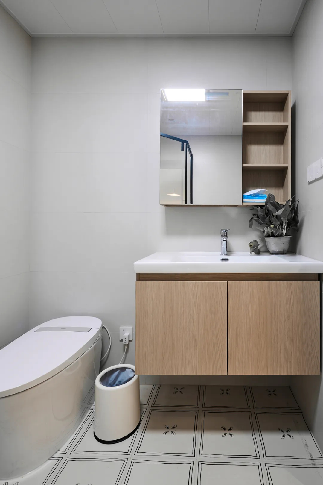 衛生間臺盆柜較大,儲物空間充足。采用原木色臺盆柜搭配黑色邊框淋浴房,配備智能馬桶,使衛生間空間顏色明暗有序,色調豐富。