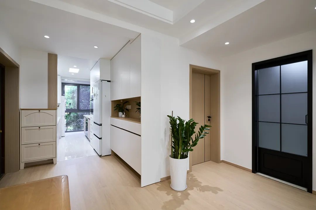 進門處的玄關柜體積較大,中間留空可放置綠植,下方留空方便放鞋。旁邊是嵌入式冰箱,充分利用了儲物空間。淺灰色的套裝門和踢腳板使空間顯得寬敞。