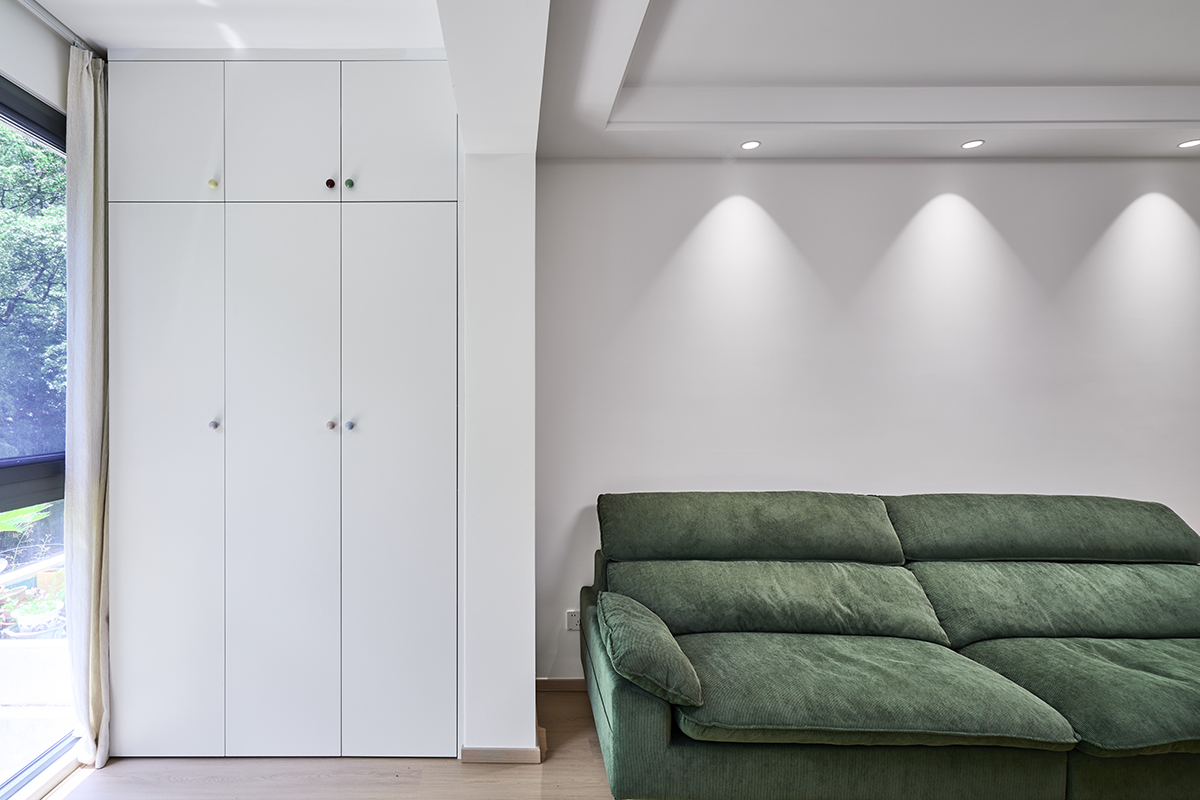 次臥目前主要作為辦公和儲物空間,為未來小孩預留。房間內擺放了1200寬的單人床和1400長的雙人辦公桌,滿足主人的居家辦公需求。