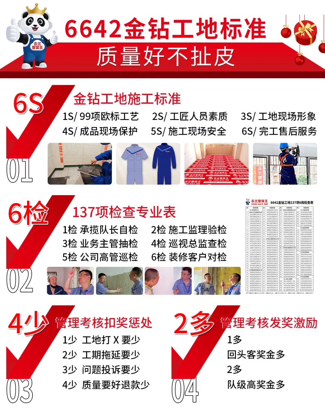 云蘭整裝王制定“6642金鉆工地標(biāo)準(zhǔn)”,標(biāo)準(zhǔn)化每一個(gè)施工項(xiàng)目,細(xì)化每一步驗(yàn)收流程。同時(shí),創(chuàng)新性將客戶反饋納入考核,嚴(yán)格化獎(jiǎng)懲措施,保障裝修質(zhì)量的穩(wěn)定與可靠。