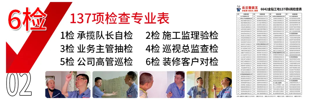 云蘭整裝王制定了137項檢查專業表,由施工監理、巡視總監、公司高管等六重崗位組成常規巡檢機制,嚴格按照表格逐項對照檢查,將問題制止在萌芽狀態,保障施工質量高標準。
