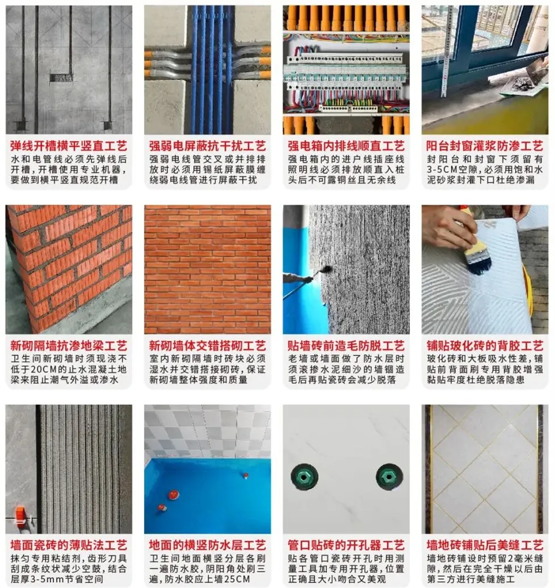 該系列涵蓋了陽(yáng)臺(tái)、水電等多個(gè)關(guān)鍵區(qū)域的項(xiàng)目。采用了多樂(lè)士、立邦等一線(xiàn)品牌的環(huán)保涂料,以及單根、紅磚、水泥砂漿封包的落水管處理,不僅提升了裝修的檔次,也保證了居住環(huán)境的健康。