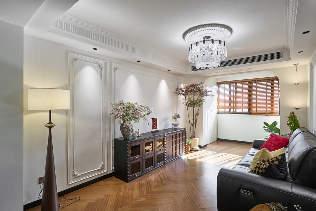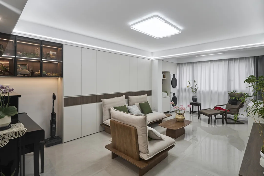 設計師為業主精心搭配了客廳家具:東南亞風格沙發、現代長柜、日式茶幾、中式逍遙椅,兼顧審美與實用;沙發背后設計了一整面白色墻柜,既滿足儲物需求,又與空間色調融合,簡潔優雅。