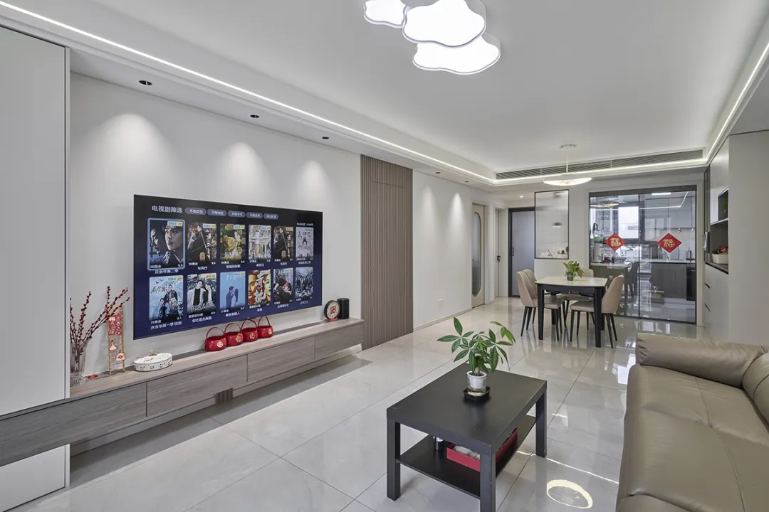 設計師根據業主需求,將客廳打造為現代時尚風格:吊頂采用流行的雙眼皮造型,搭配暖灰色地磚,營造出簡潔大氣的氛圍。并將利用一面墻為臥室做隱形門,既提升了美觀度,又兼顧空間連貫性與私密性。