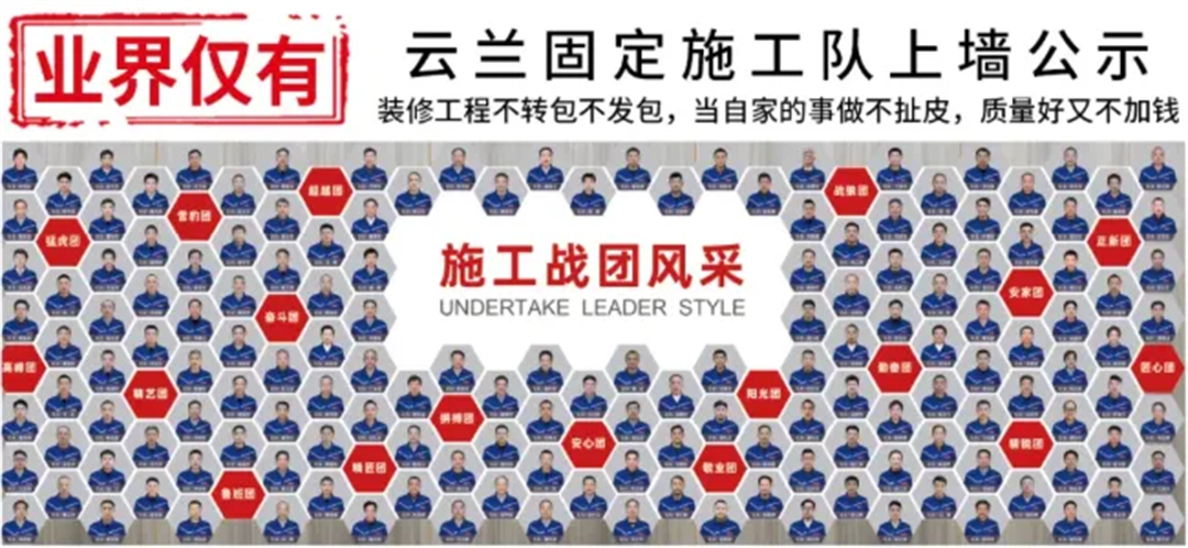 云蘭整裝王堅決不搞發包和轉包。業界僅有:云蘭固定施工隊上墻公示,裝修工程不轉包當自家事做不扯皮,質量好又不加錢。