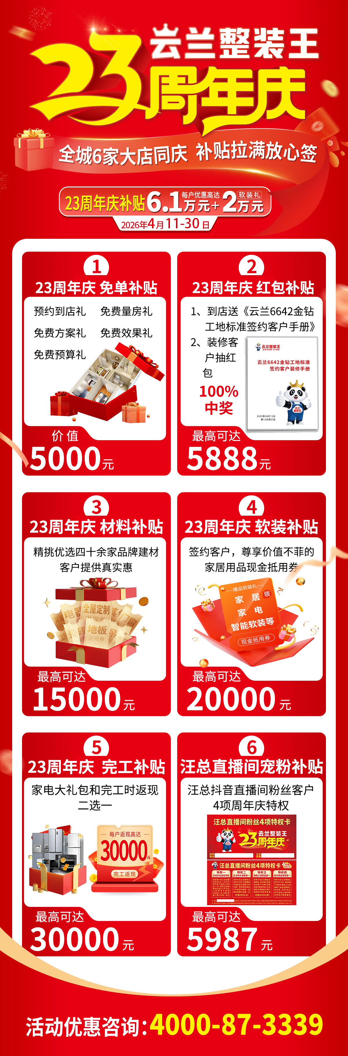 值此公司成立23周年之際,云蘭整裝王隆重推出"靠譜家裝節"周年慶活動。本次活動將于4月11日-26日在全城6家大店同步舉行,以"全城6家大店同慶,補貼拉滿放心簽"為主題,打造真靠譜家裝普惠行動。