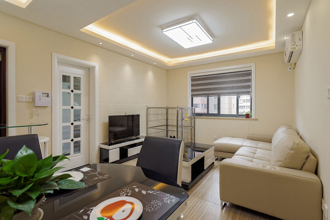 客廳以灰色墻面搭配原木色地板,簡約的背景墻設計,看起來干凈清爽,同時搭配撞色系的藍色沙發,局部亮色點綴,起到畫龍點睛的作用。