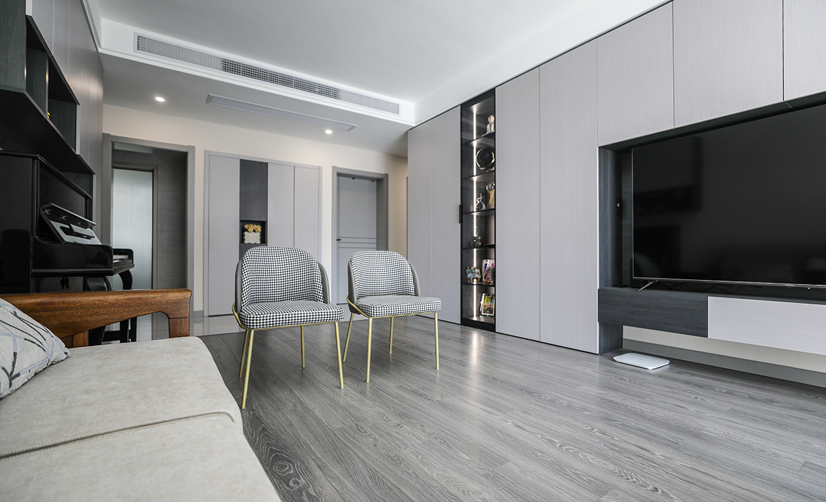 玻璃柜內的裝飾品被層板燈點綴的恰到好處,頂上的射燈作為輔助光為電視墻增加氛圍感,淺灰為主色調,黑色點綴,讓空間不便時尚而且清爽。