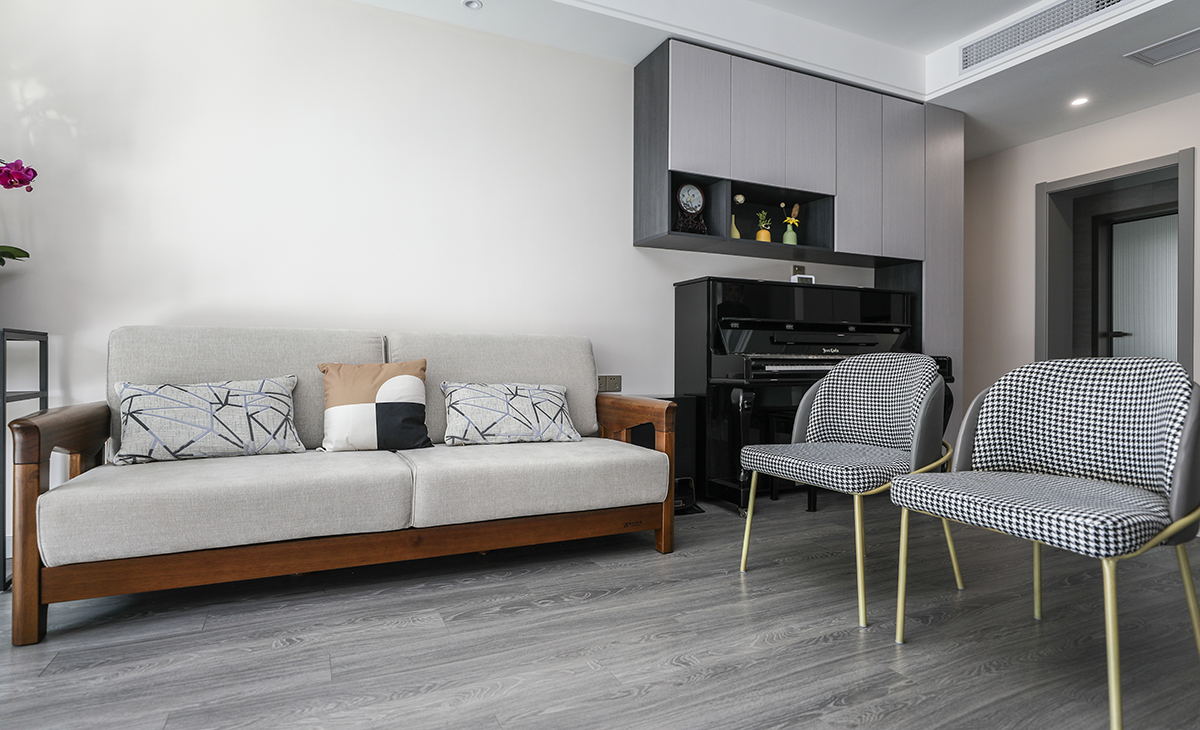 沙發背景刷米色涂料,留白設計,黑白相間的儲物柜和黑色的鋼琴相呼應,色調上用實木沙發米灰色座墊和背景的米色相呼應,和地板相銜接,顯得既大氣又時尚。