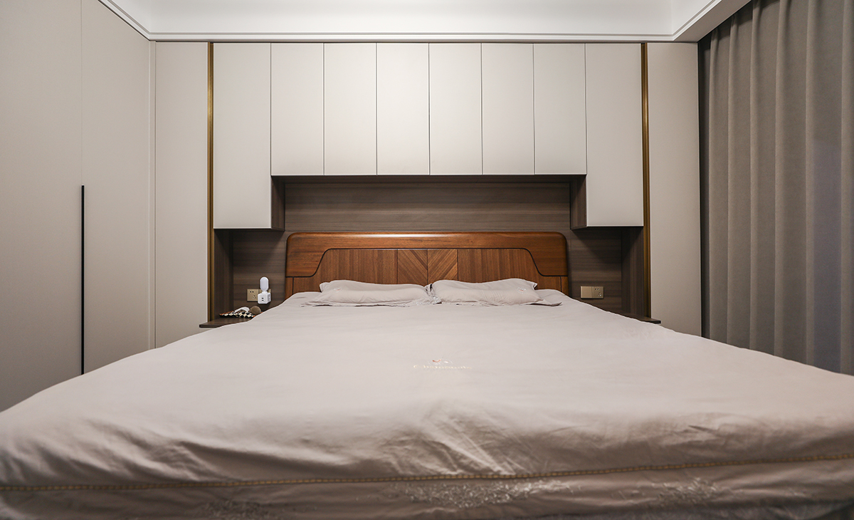 主臥做了兩面儲物柜,造型上以方正為主,顏色上深淺搭配地錯落有致,灰色地板,墻面米色衣柜門板,頂面白色乳膠漆,輕巧時尚的吸頂燈,空間很溫馨和諧。