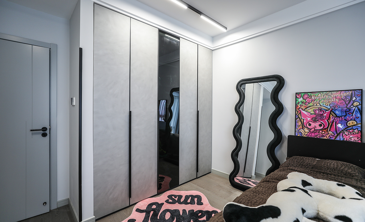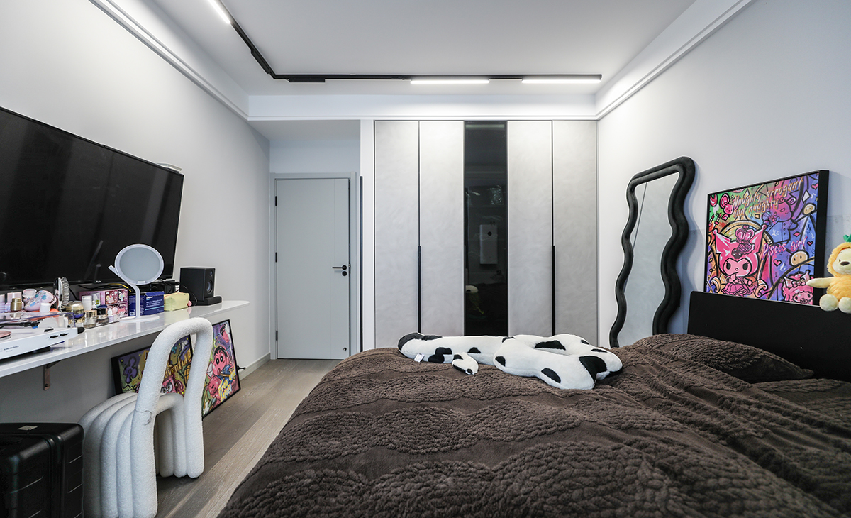 該套居室整體裝修風(fēng)格是黑白灰風(fēng)格,背景墻沒有做以大面墻留白,僅用掛畫來修飾,床采用黑色皮質(zhì)床,體現(xiàn)黑白灰的大氣時(shí)尚,有質(zhì)感
