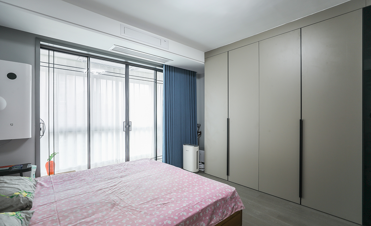 次臥是父母的空間,比較簡潔,做一個(gè)L型開放式衣帽間,墻面藍(lán)色乳膠漆,色彩上干凈、簡煉,空間上靈活自如,簡潔明亮。