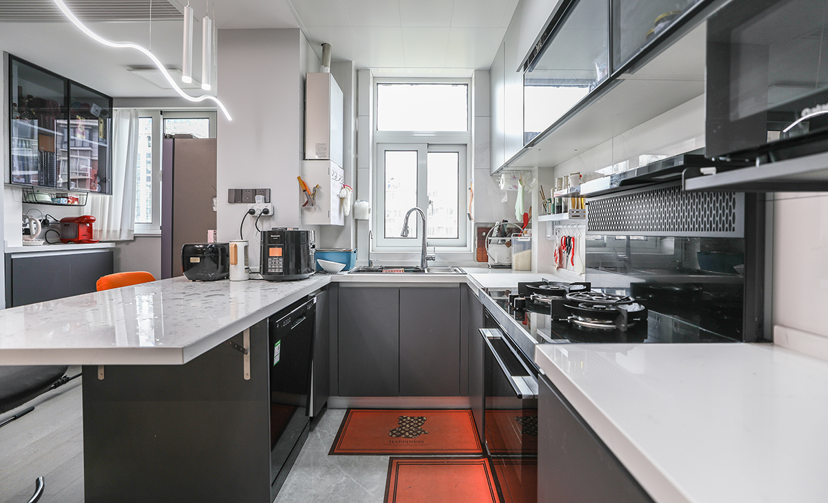 廚房開放式,與餐廳相連,讓主人做飯又可以和客人互動(dòng),滿足主人對美食文化的追求,色調(diào)上以白色為主,配上黑色電器,高檔有神秘感。