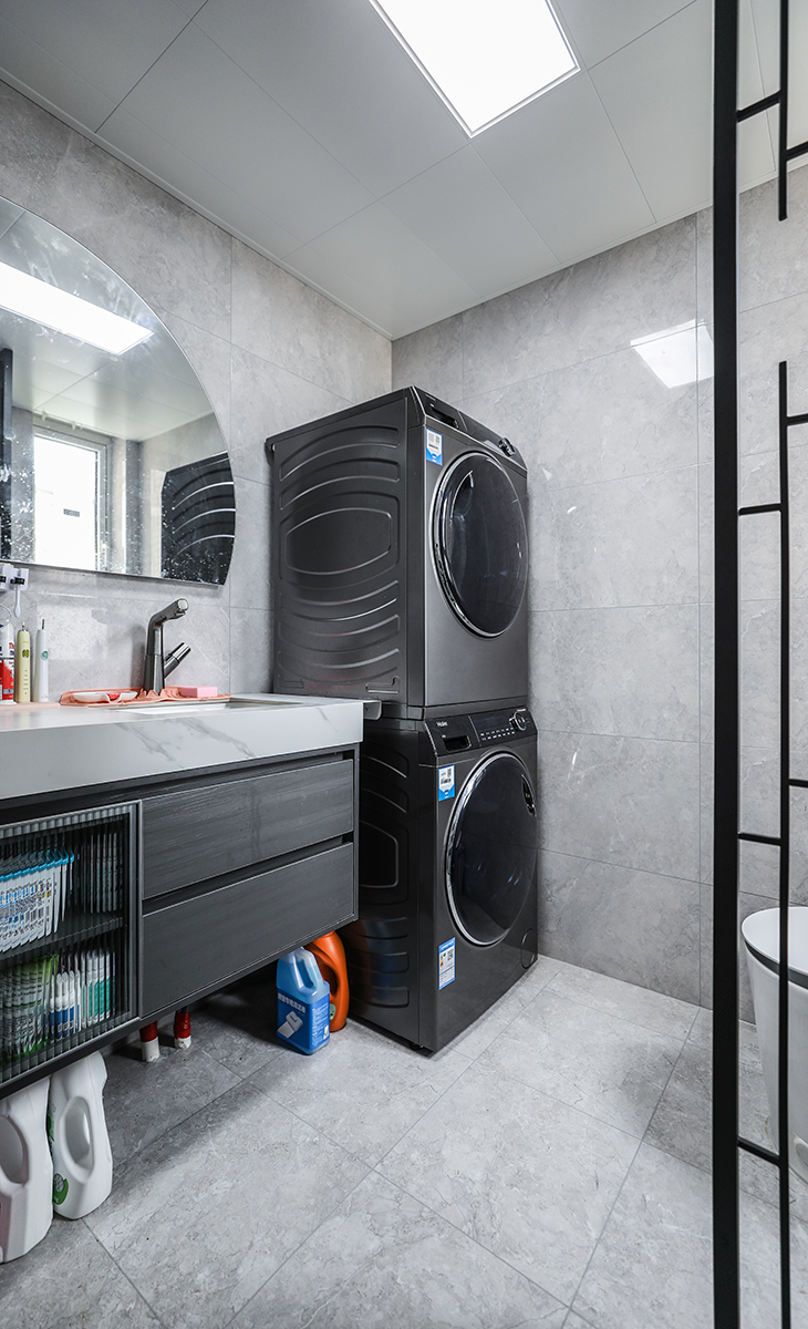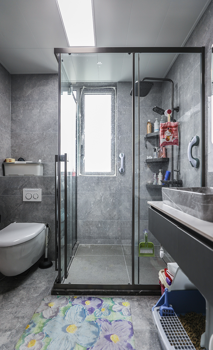 衛(wèi)生間空間很大,淋浴間與洗漱空間用透明玻璃分隔開來,做到了布局的干濕分離,利于打掃,且視野上更加寬闊
