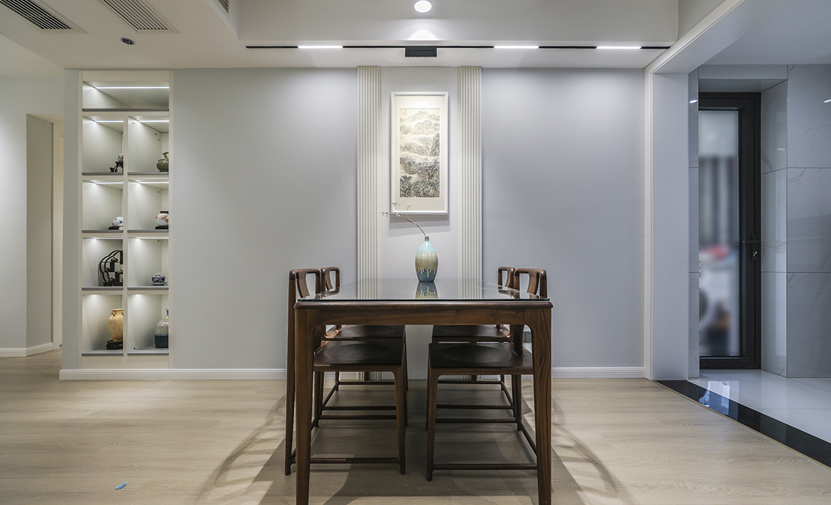 客餐廳一體化設計,令空間更加開敞和大氣,餐桌沒有繼續沿用奶油風,而是采用新中式風格的桌椅,顏色上也略厚重,更顯格調。