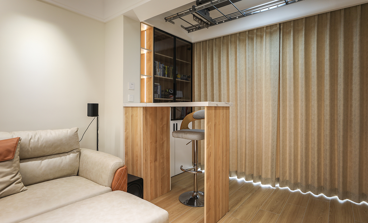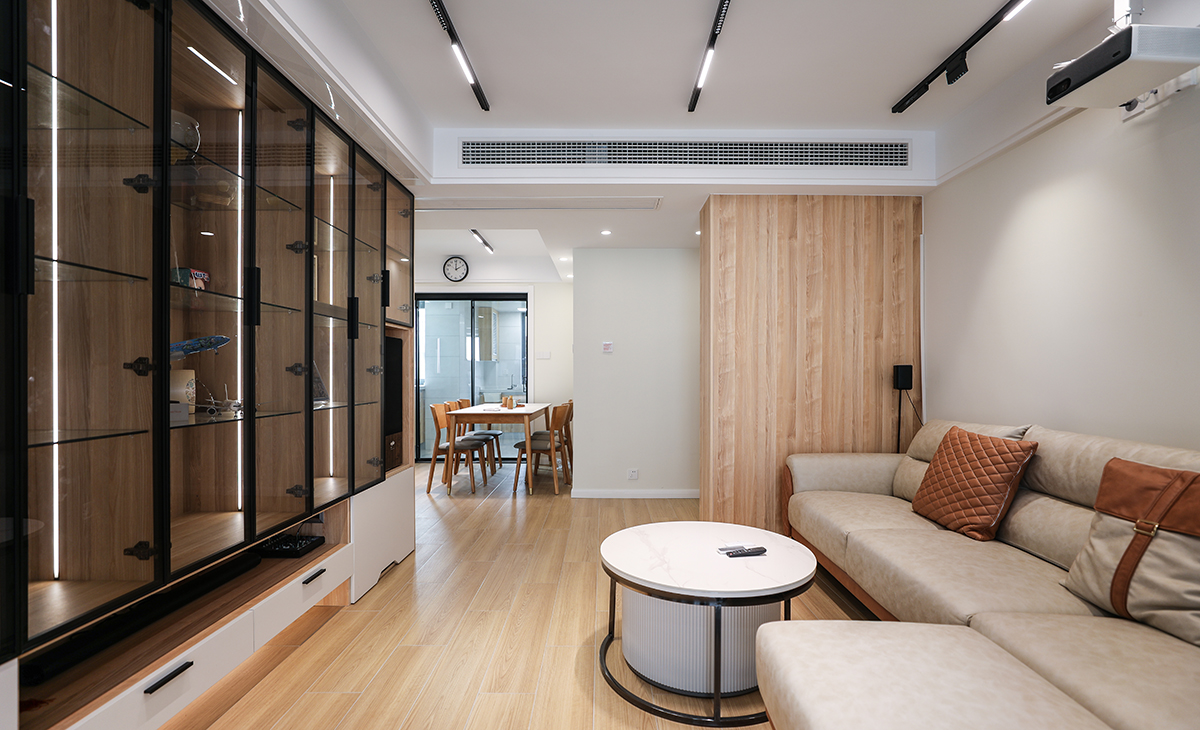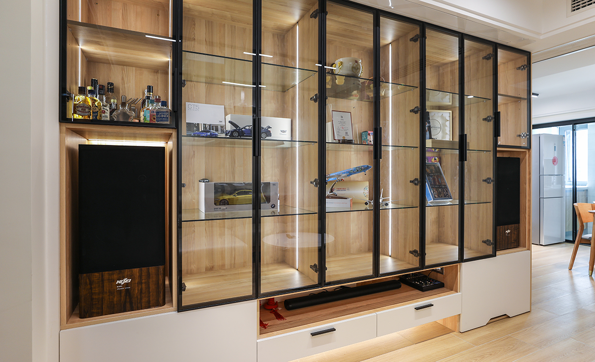電視背面采用組合玻璃柜加上暗藏式投影來設計,即增加了儲物功能,也可以休閑娛樂,讓整個空間活躍起來。