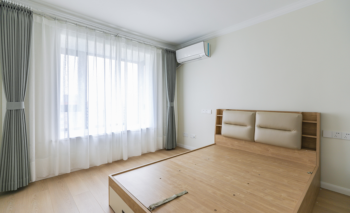主臥簡單大方,沒有多余的色彩,原木色的家具加上原木色的地板,墻面采用網紅色可可蛋奶,清新干凈。