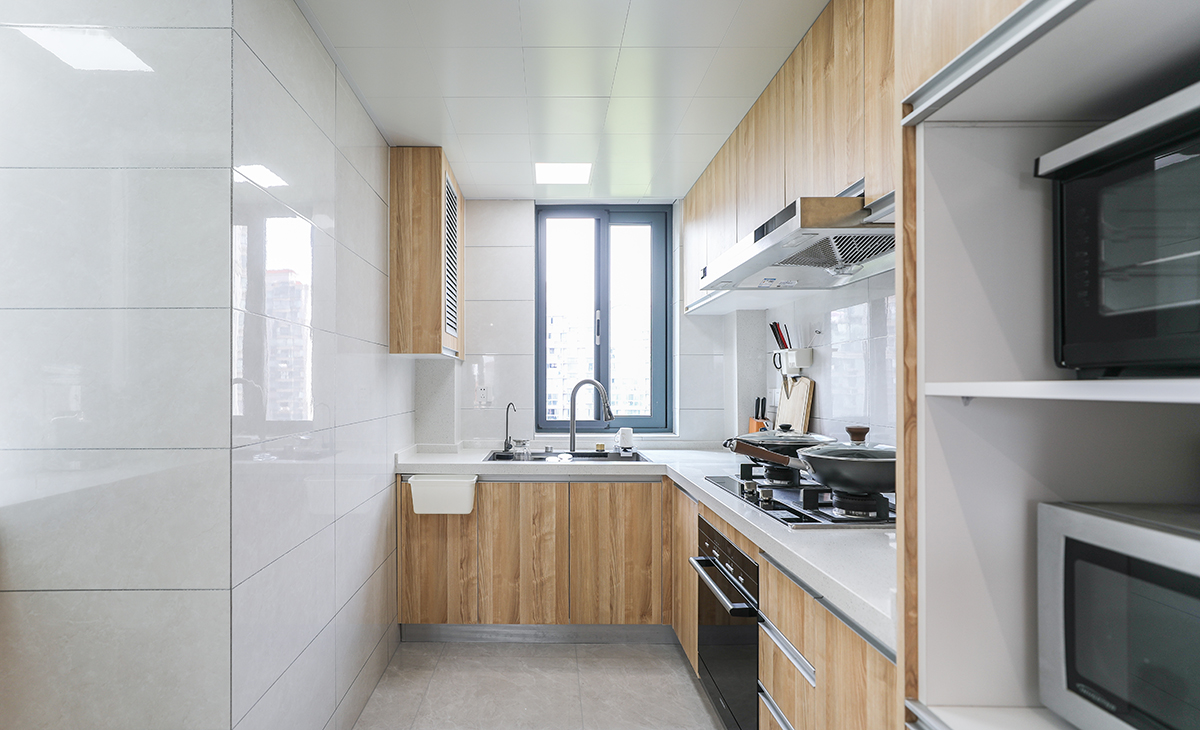 廚房利用了北陽臺延伸,增加使用空間,一樣采用了原木色系為主打色。和整體風格相呼應。