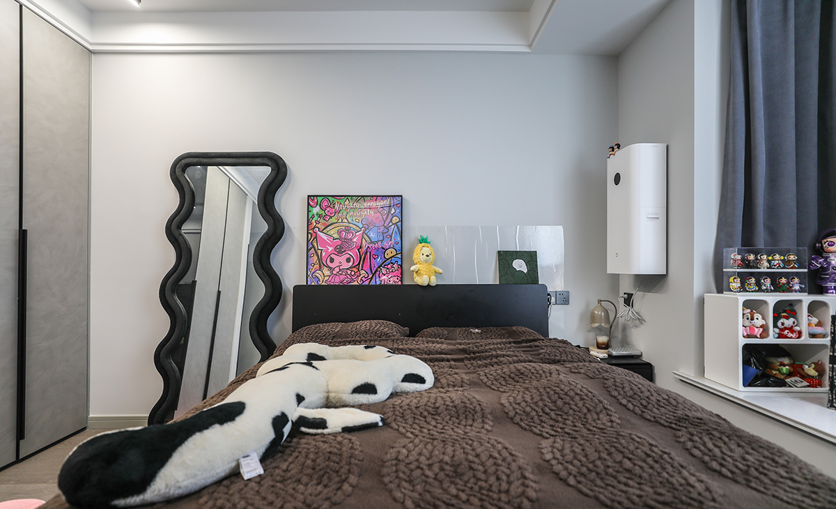 該居室男女主人都是40歲左右的中年成功人士,生活品質要求高,喜歡黑白灰色調,不喜歡家里很亂,對黑白灰風格有獨特理解,在軟裝和色彩上要求極簡,所以該套居室整體裝修風格是黑白灰風格,背景墻沒有做以大面墻留白,僅用掛畫來修飾,床采用黑色皮質床,體現黑白灰的大氣時尚,有質感,凸現了主人雍容華貴的氣質和非凡不俗的眼光,體現了主人優雅的內涵和高尚的審美情操。