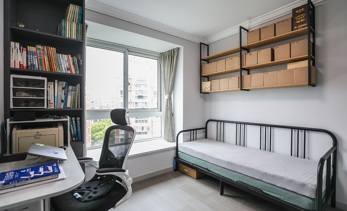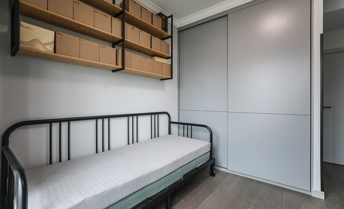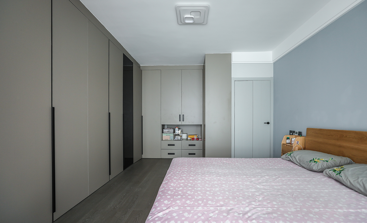 次臥是父母的空間,比較簡潔,做一個L型開放式衣帽間,墻面藍色乳膠漆,色彩上干凈、簡煉,空間上靈活自如,簡潔明亮。