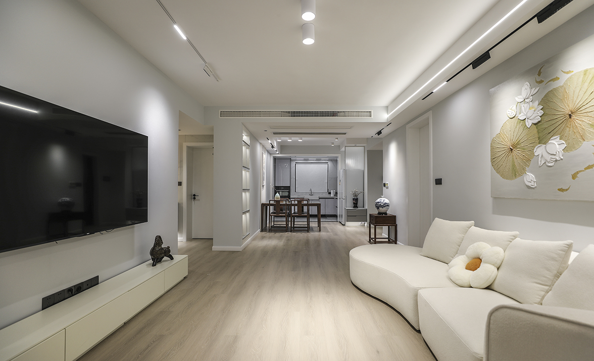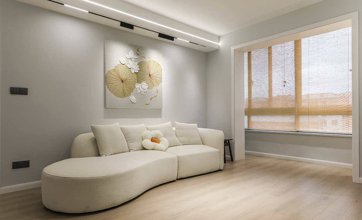 整個客廳以奶咖色打底,藝術感造型的沙發使整個空間呈現出一種優美、流暢的美學感,質感與溫度共存。