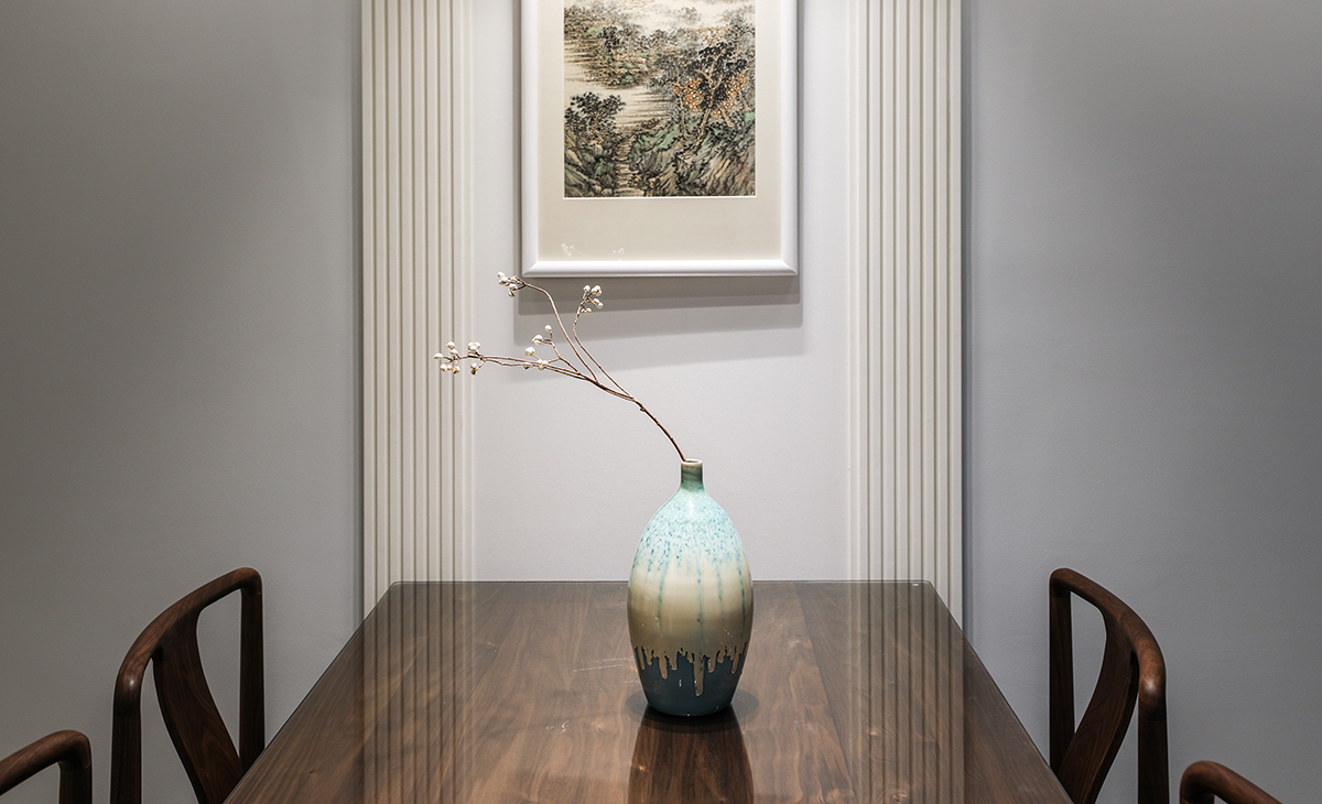 客餐廳一體化設計,令空間更加開敞和大氣,餐桌沒有繼續沿用奶油風,而是采用新中式風格的桌椅,顏色上也略厚重,更顯格調。
