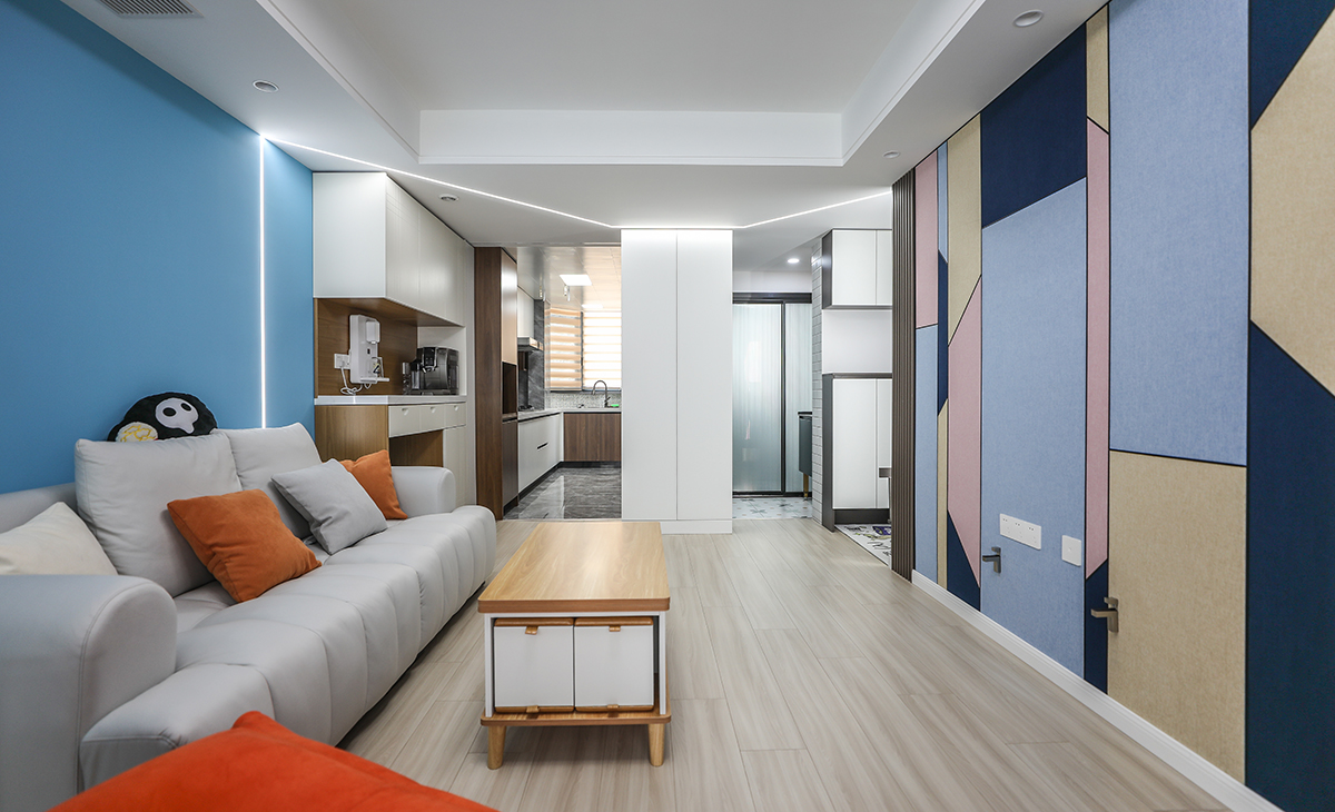 裝修風格是現代混搭風格,臥室門是隱形門,客廳電視背景墻選用幾何墻布,既輕巧又大氣。灰色長沙發搭上橘黃色懶人椅,體現了主人成熟穩重的性格以及活躍思維。