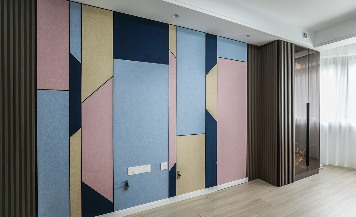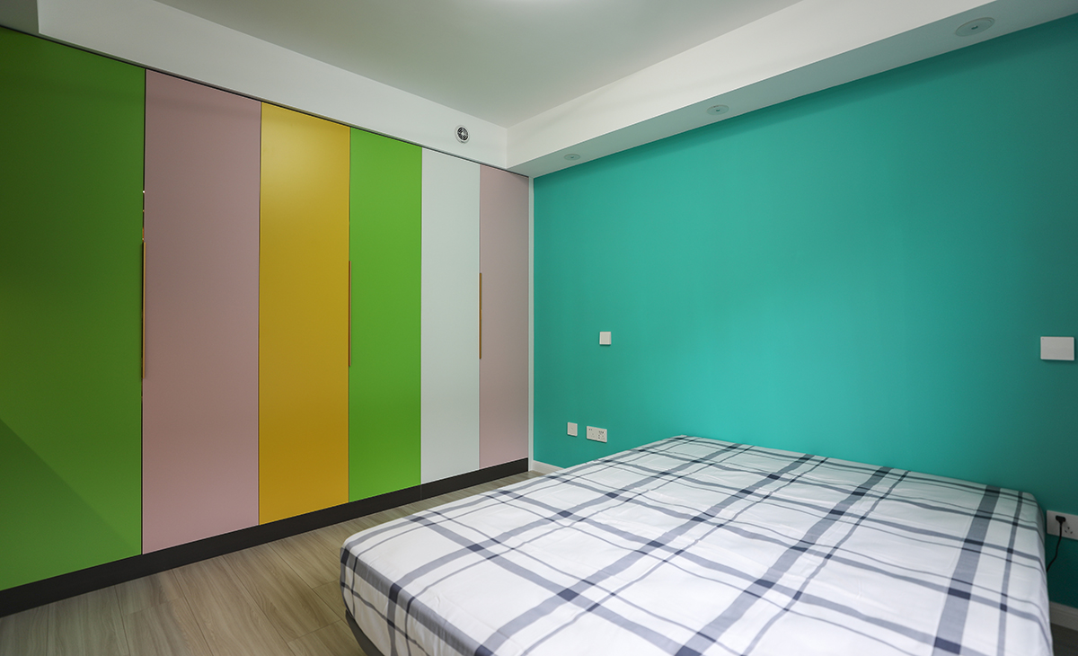 五顏六色的衣柜門,可以更方便主人分類擺放衣物,配上茶色的裝飾柜,色彩上豐富多彩,空間上靈活自如,簡潔明亮。