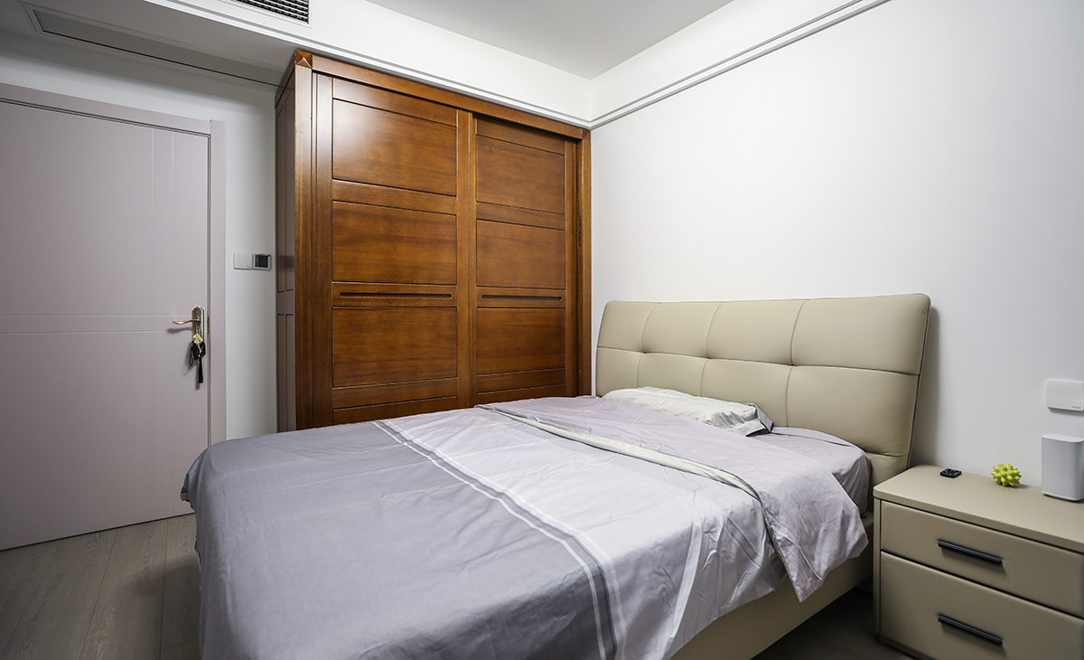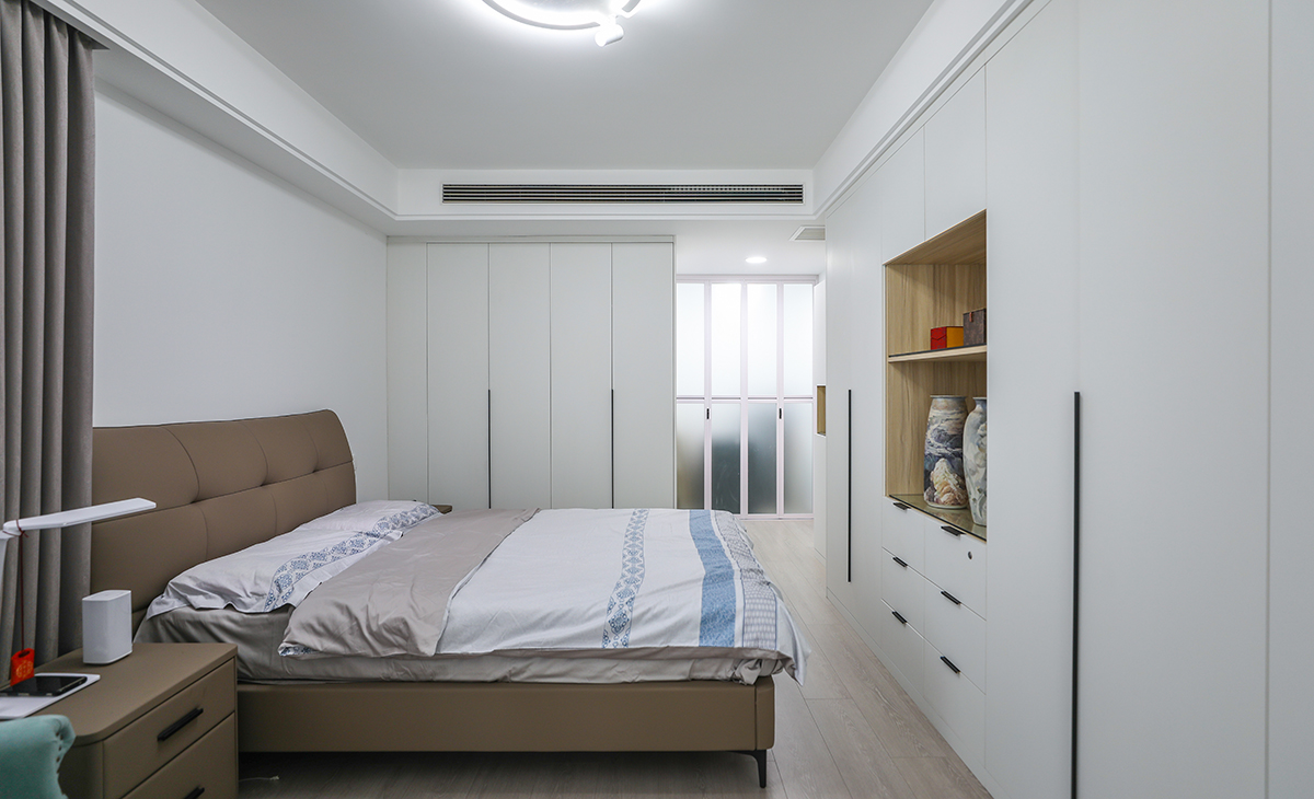 進門玄關柜的設計也是一大亮點,進門左側下方鞋柜和儲藏間柜子共用一面墻體,做到了空間利用的最大化。中間鏤空的鞋柜柜體,給客戶提供了展品區,是進戶歸家第一道風景;下方鏤空設計,進戶臨時儲鞋干凈整潔。
