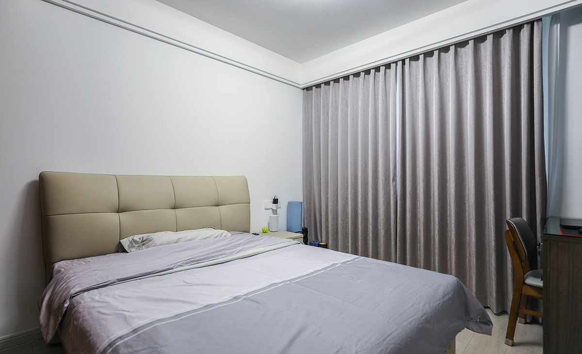 客廳是客戶平時休閑和繪畫創作的場所,要求寬闊、明亮。在陽臺區域特意設置多束燈光,提供給客戶創作需要的均勻且明亮的亮度要求。藍灰色皮質沙發配白色方型茶幾加上淺木色復合地板,造型和色調上無不給人以簡潔、大氣、時尚的感覺。