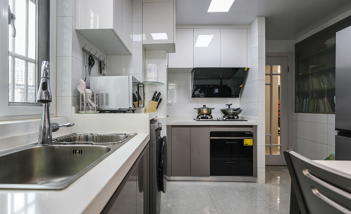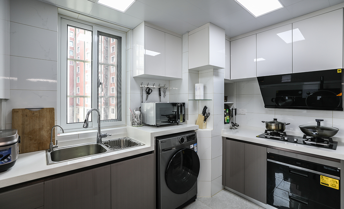 廚房比較大兼做日常餐廳,色調上以暖灰色為主,配上黑色電器,高檔有神秘感。
