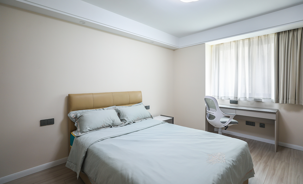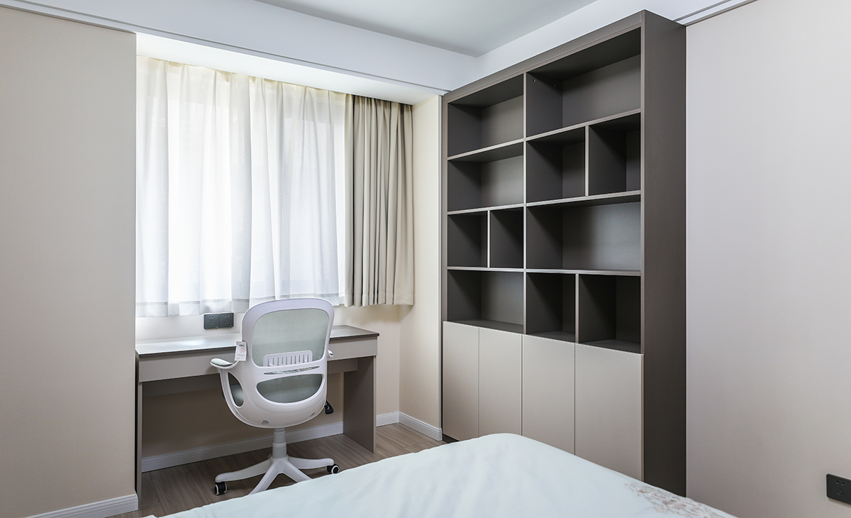 臥室做了轉角衣柜流出來的過道直角通向衣帽間,私密度更好儲物翻了一倍,色調還是以大氣的奶咖色,時尚耐看。