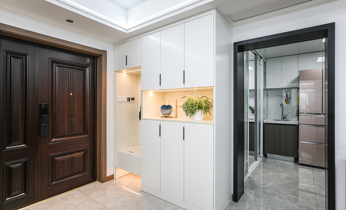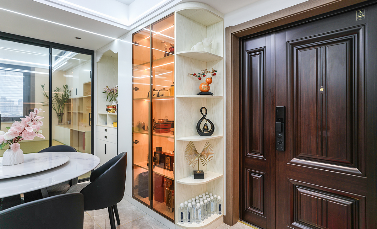 原先門洞的位置改造成酒柜,男主人有收藏酒類的習慣,加上燈光氛圍烘托,也可以當成端景背景使用。
