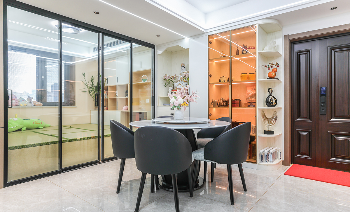 現代餐廳突出的是實用與美化兩方面功能,因地面具有特殊性,更注重的是實用,一定要易于清理,同時防水及防油的效果要好,地面采用800*800玻化磚進行鋪貼,配合餐邊柜使用,使餐廳空間充滿濃濃的生活氣息。