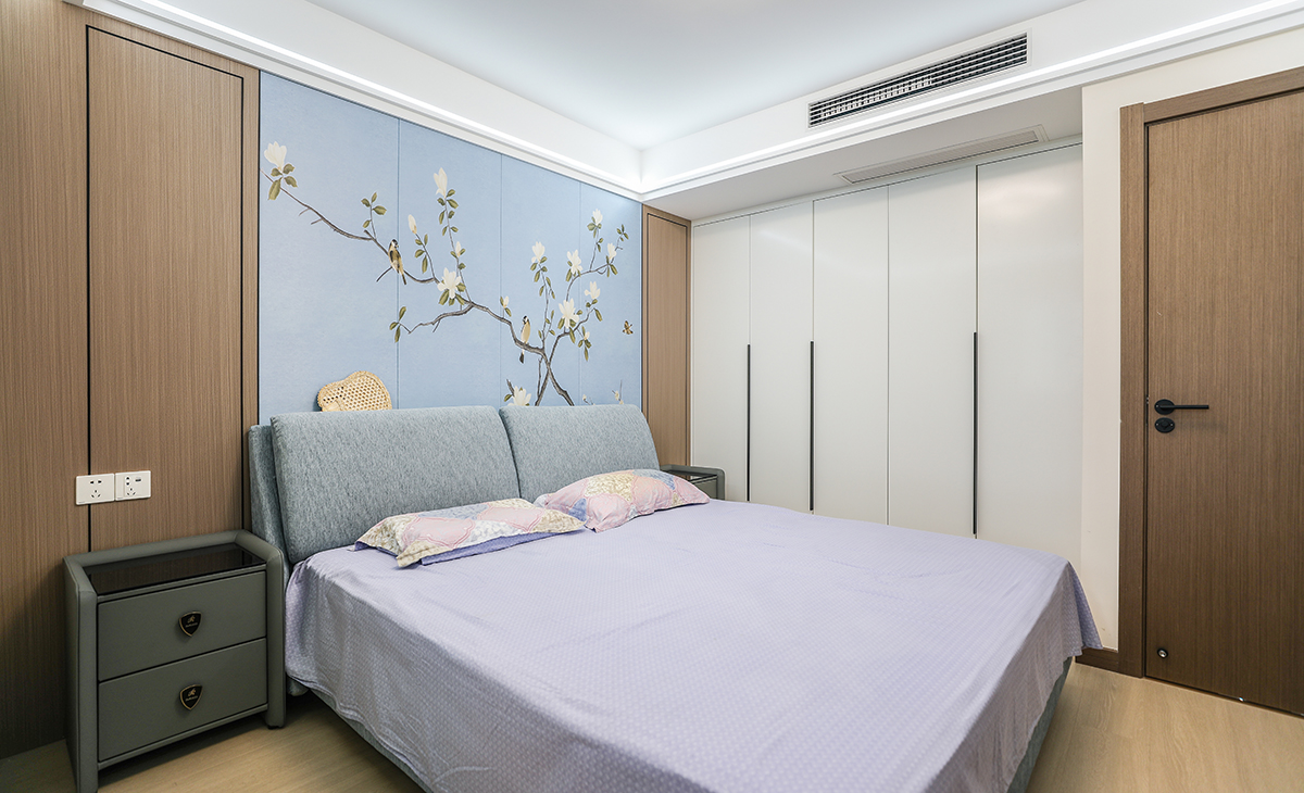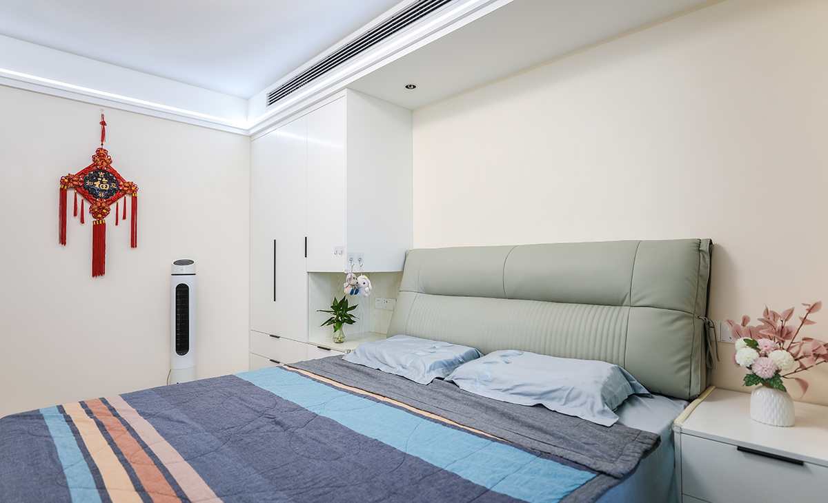 人一生中至少有三分之一的時光都在臥室度過,臥室的重要性不言而喻,主臥使用原木色地板,吊頂使用雙眼皮吊頂,增加空間層次感,頂面大面積以白色襯托,床頭背景木飾面和背景畫做裝飾,衣柜門板用的淺灰色,使整個空間一瞬間變得典雅高貴。把整體設計的理念體現的淋漓盡致:剛柔并進,冷暖搭配,線條明快。