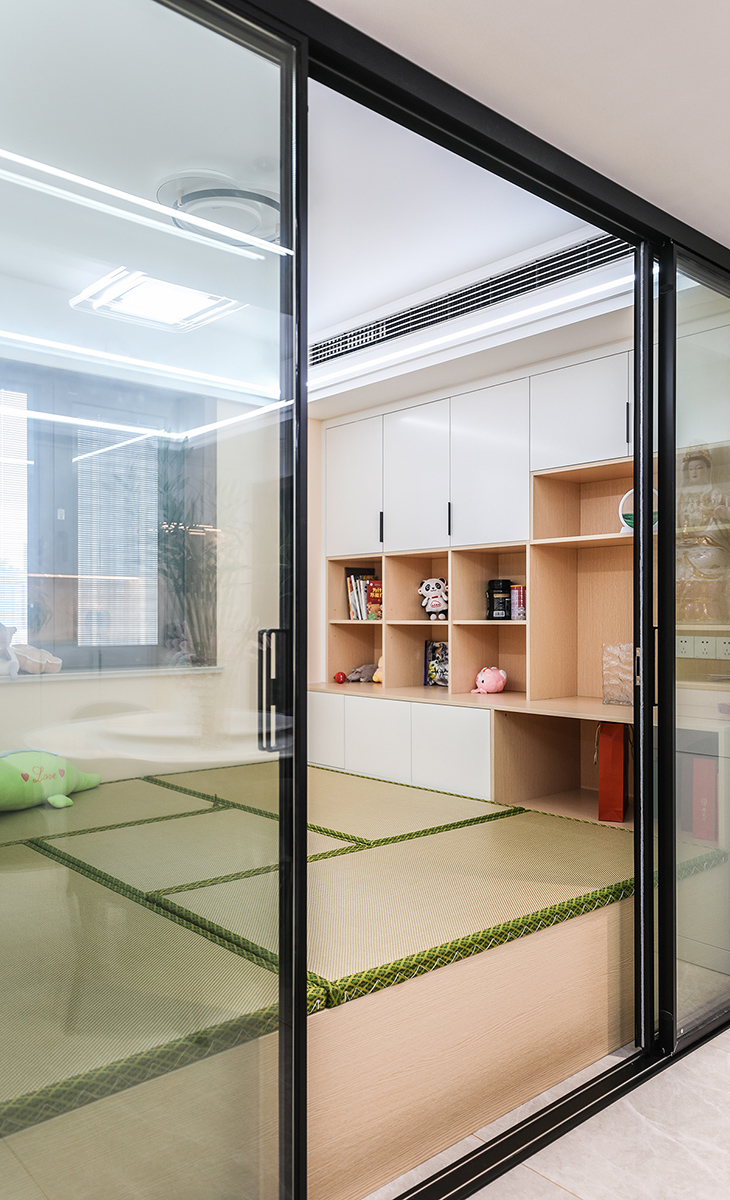 小次臥做了榻榻米和寫字臺,平時做書房用,榻榻米作為一種多功能家具,在當下受到很多年輕人的喜愛,榻榻米很經濟,一種家具可以滿足床,地毯,凳椅或沙發等多種功能,在滿足日常需要的基礎上,又節約成本。