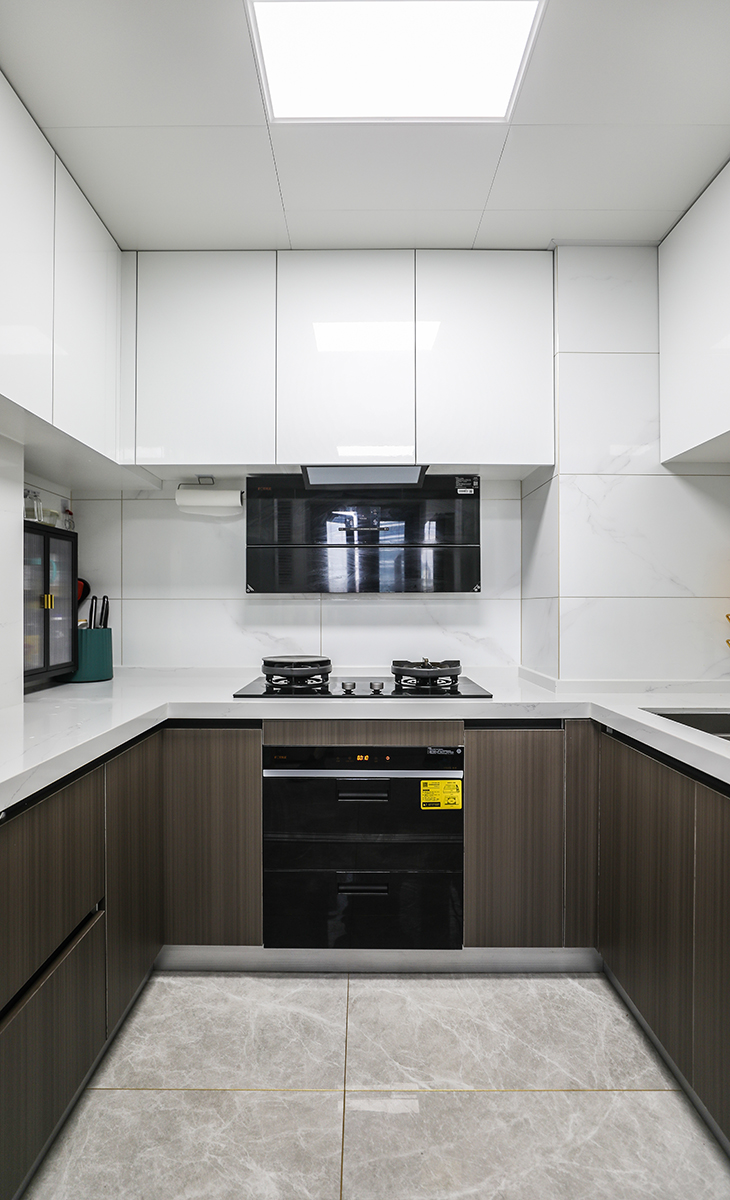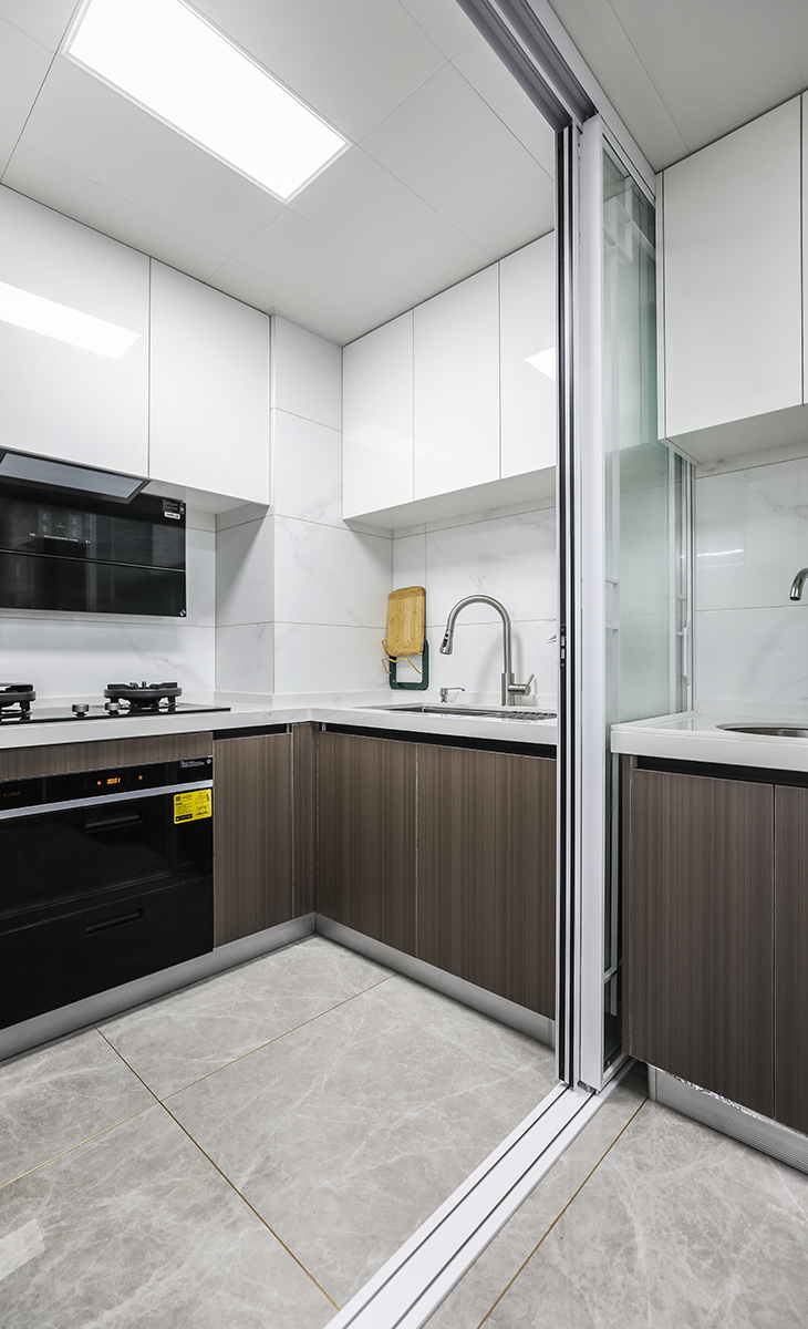 廚房空間很大,簡約的廚房設計,顏色的選擇不會太復雜,白色是常用到元素,使空間有了留白的感受,使用白木與灰木紋色,讓視覺的焦點停留在這上面,線條干凈利落。并且是中西廚兩相結合,中式菜肴在中廚里實用,隔絕了油煙的問題,