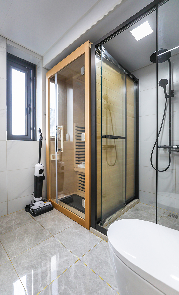 時尚的現代簡約衛生間,強調的是去繁留簡,常見的線條和幾何圖形的交織便能將衛生間個性展現出來。在衛浴建材的選擇上,使用摩恩的智能潔具,更加人性化,長方形的現代浴室柜設計,大氣簡約,簡單的配上長方形的浴室鏡,在材質上并不是按照傳統的設計相統一,只在色彩上加以邊框形成上下呼應的感覺。加配汗蒸的功能,忙碌的一天結束后到汗蒸房出出汗,隔壁就是淋浴,可以消除一身的疲勞。在整體空間上形成階梯效果,高低錯落,層次感強烈,現代的“簡便得以呈現。