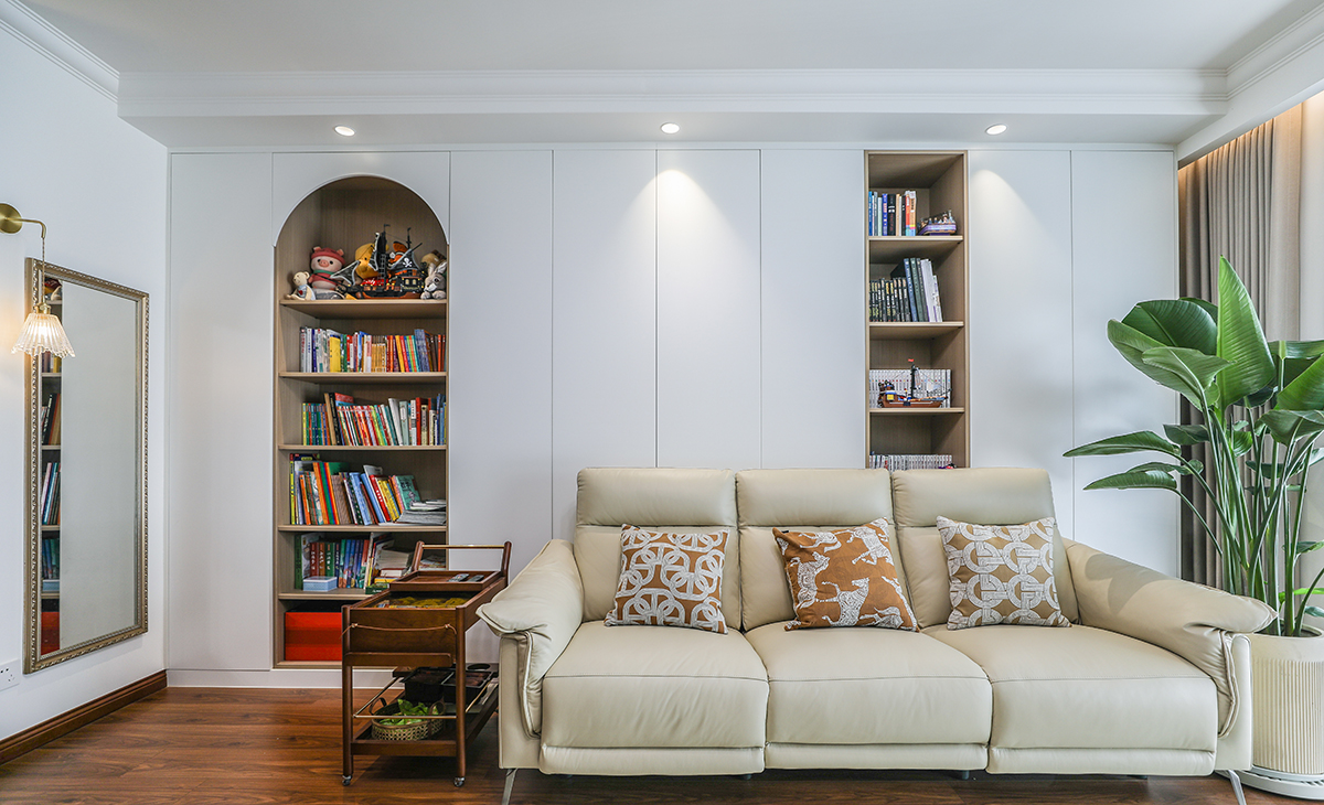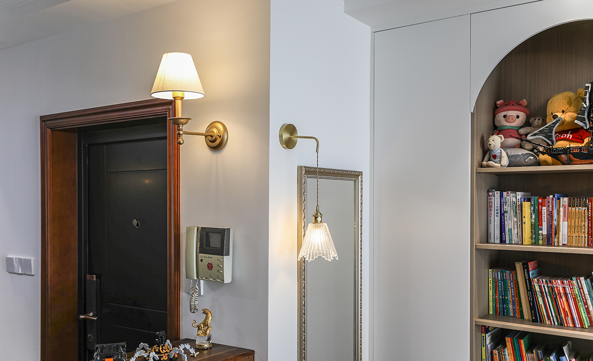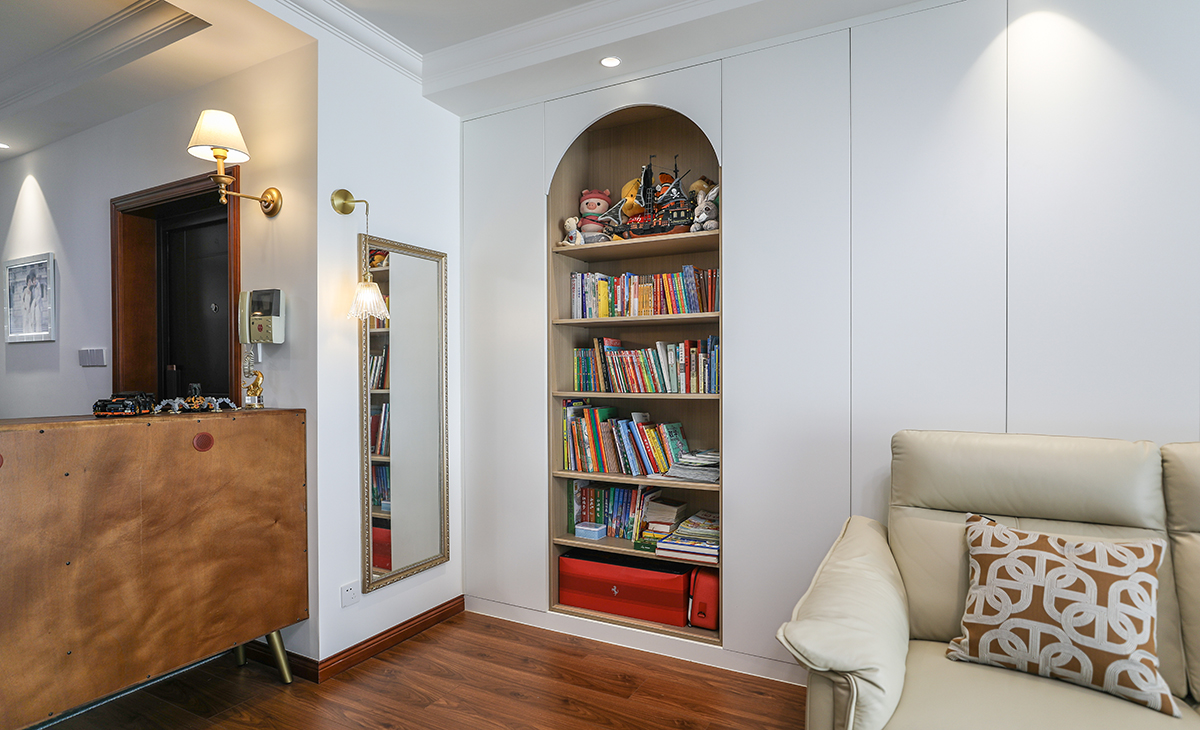 次臥是孩子的空間,比較簡潔,墻面乳膠漆,色彩上干凈、簡煉,空間上靈活自如,簡潔明亮。