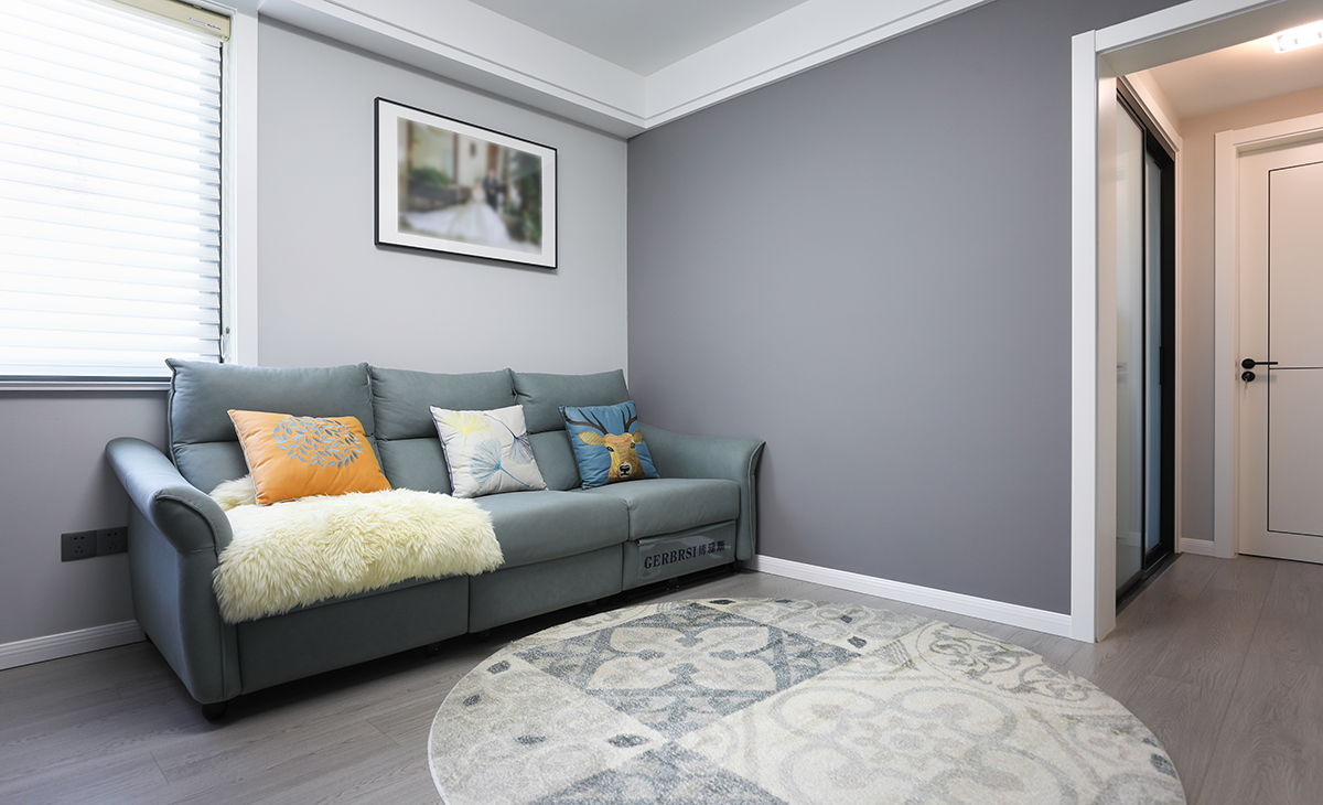 整個客廳以簡約為主,主要由于客廳空間布局并不富裕,空間感通過不同灰度拉開層次,并且在局部運用了亮色作為點綴豐富場景,比如沙發上的抱枕,電視柜的木飾面,地板同樣采用灰色系,搭配地毯的材質對比,增加空間的樂趣。