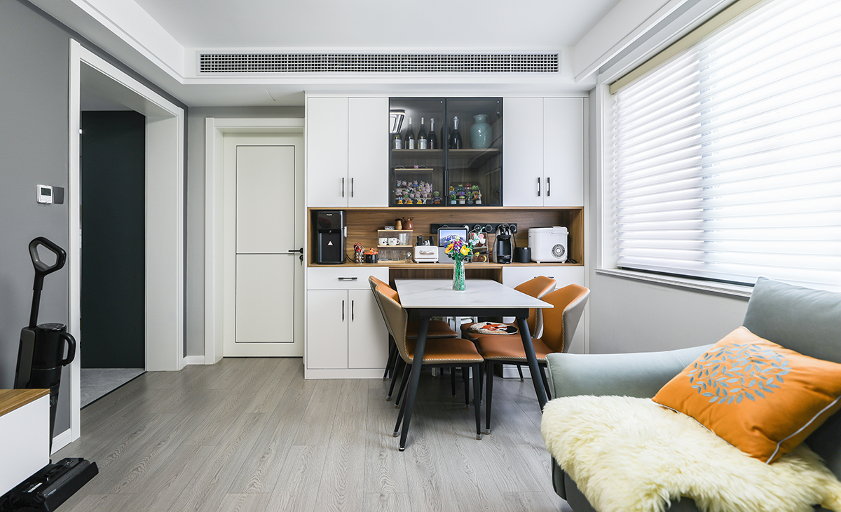 餐邊柜整體原木色搭配奶白色門板,依然主打簡約,搭配巖板的餐桌,