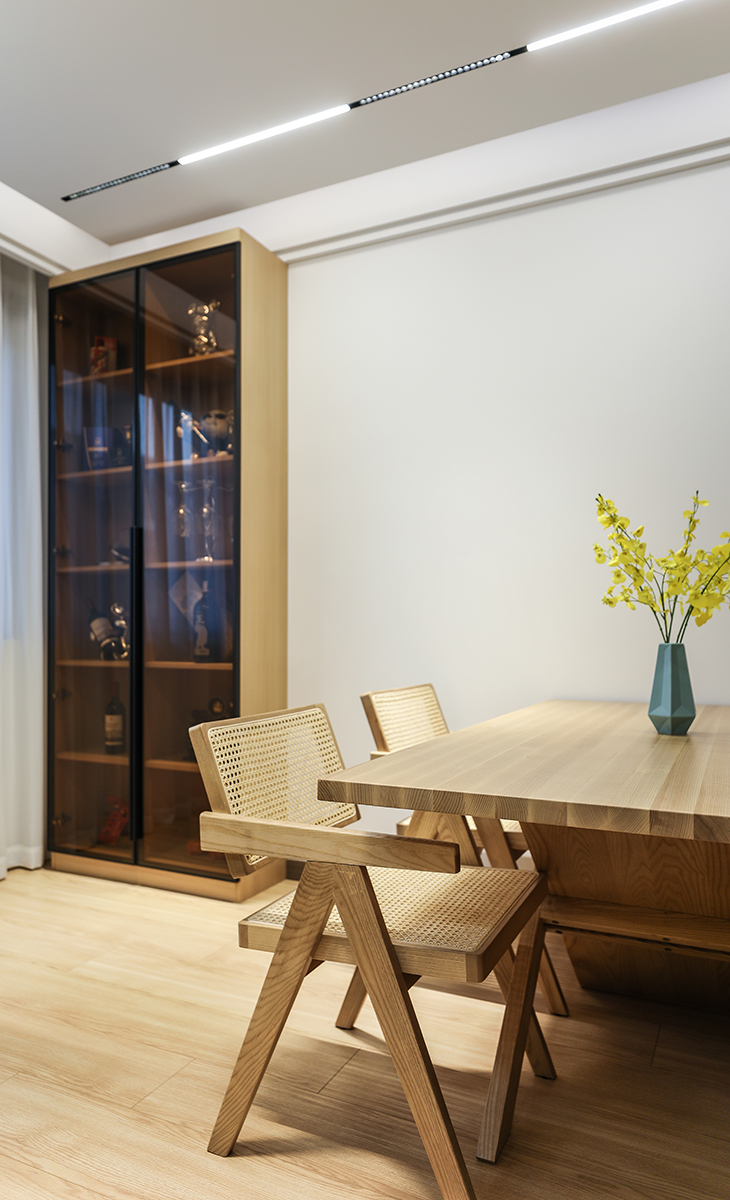 餐廳空間原本連著陽臺,把原有的陽臺敲掉,左邊放了一個冰箱,右邊放了一個玻璃柜,配上原木色的餐桌和椅子,線性燈拉長了整個空間,空間視野效果更明亮、寬敞。